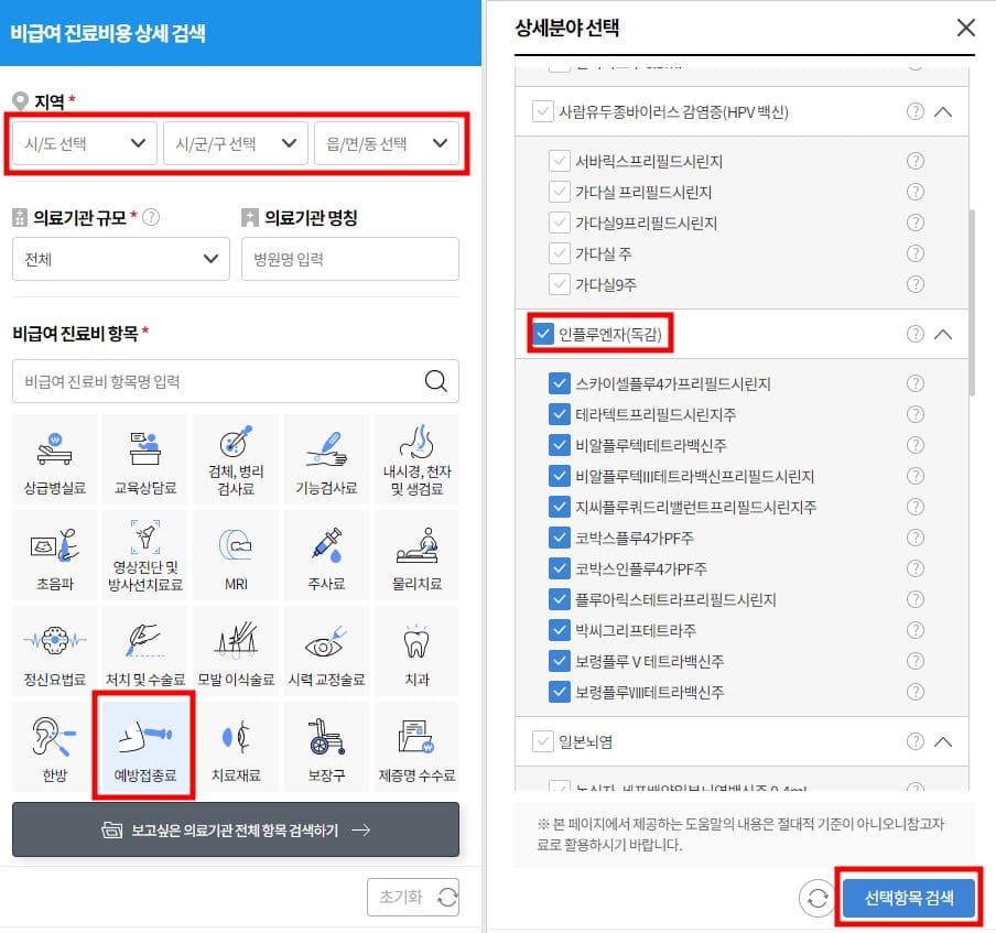 ④ 화면 좌측에 지역 및 의료기관 규모 선택 후 비급여 진료비 항목 하단에 예방접종료 선택