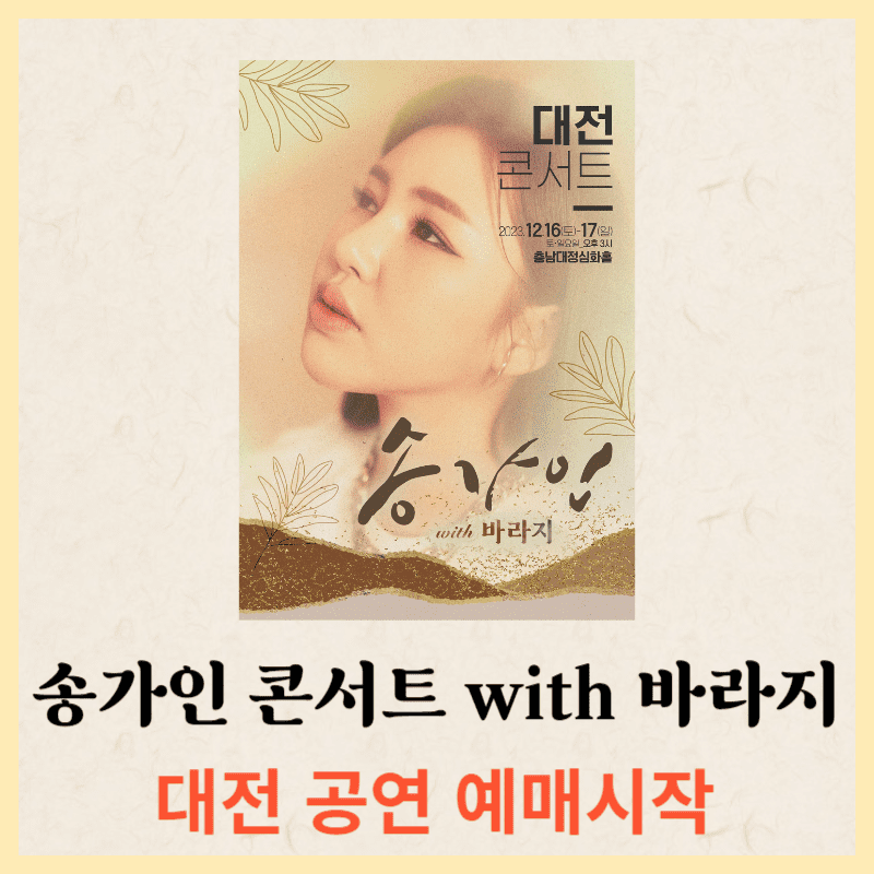 겨울로 향해가는 12월 송가인과 함께 하시겠습니까? 2023 송가인 콘서트 with 바라지 대전 공연 예매가 9월 22일 09시부터 시작이 됩니다. 예매 일정과 방법에 대해서 알아보도록 하겠습니다. 알려드리는 내용 확인하시고 좋은 자리 놓치지 마시기 바랍니다.