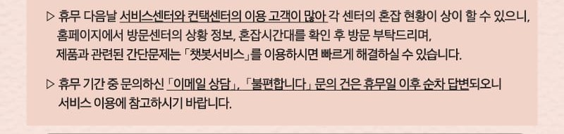 - 휴무기간 중 문의하신 '이메일 상담' 및 '불편합니다' 문의 건은 휴무일 이후 순차적으로 답변이 됩니다.