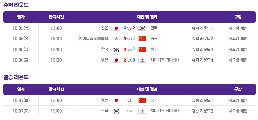 | 항저우 아시안 게임 야구 결승전 일정 중계보기 (0) | 2023.10.07 |