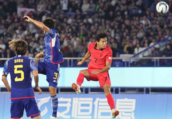 결승에 진출한 대한민국 대표팀은 숙적 일본을 맞이합니다.  전반 시작하자마자 일본의 우치노에게 실점을 허용한 대한민국 대표팀을 정우영 선수가 다시 한번 구해냅니다. 전반 26분 오른쪽 측면을 돌파한 황재원 선수의 크로스를 정우영 선수가 헤더로 마무리하여 동점을 만들어냅니다.